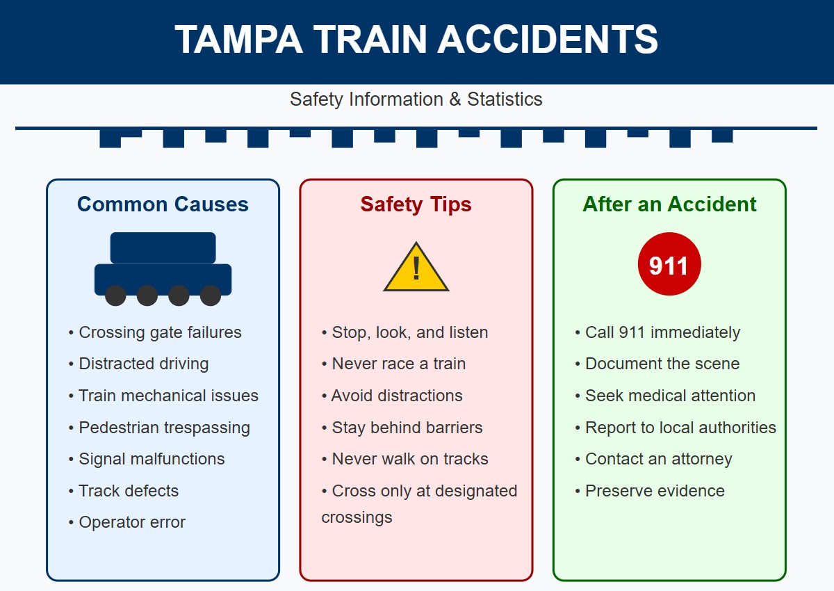 Train accidents in Tampa may not be frequent, but when they happen, the consequences are often catastrophic. At Burnetti, P.A., we provide experienced legal representation to victims and families affected by train collisions, derailments, and other rail-related incidents throughout the Tampa Bay area. Whether your accident happened near the CSX rail yard in Ybor City, at a crossing in Seminole Heights, or involved a commuter line, we’re here to help you seek accountability and compensation.